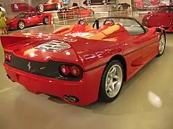The Ferrari F50 (Type F130) is a limited production mid-enginesports car manufactured by Italian automobile manufacturer Ferrari from 1995 until 1997. Introduced in 1995, the car is a two-door, two seat targa top. The F50 is powered by a 4.7 L naturally aspiratedTipo F130B60-valveV12 engine that was developed from the 3.5 L V12 used in the 1990 Ferrari 641 Formula One car. The car's design is an evolution of the 1989 Ferrari Mythos concept car, while Pininfarina incorporated design cues from contemporary F1 racecar designs, particularly at the front.[7][8]