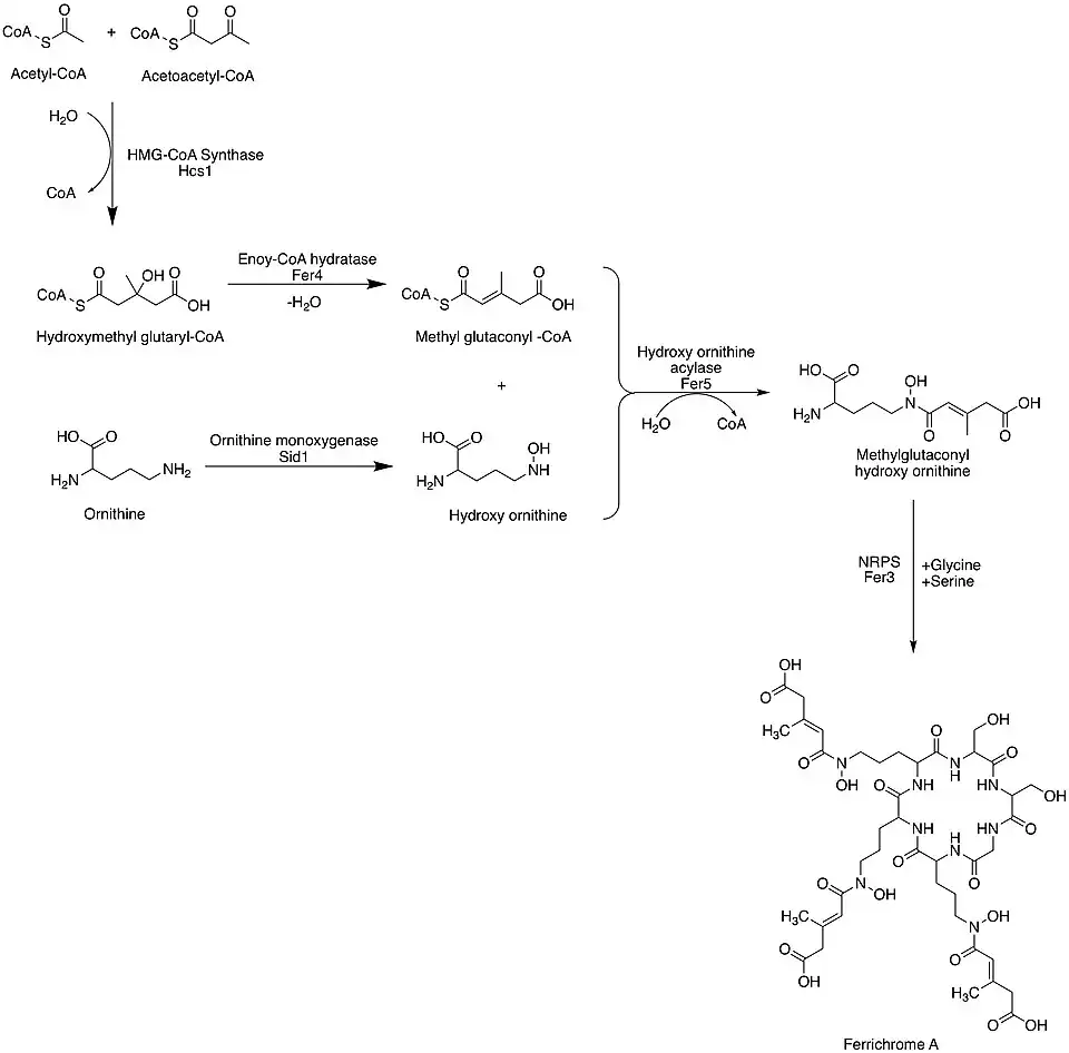 In U. maydis, the ferrichrome A biosynthetic pathway begins with the HMG-CoA synthase (Hcs1) of acetyl-CoA and acetoacetyl-CoA for generation of hydroxymethyl glutaryl-CoA (HMG-CoA). The next step involves the conversion of HMG-CoA to methyl glutaconyl-CoA via enoyl-CoA hydratase (Fer4). Methyl glutaconyl-CoA is then coupled with hydroxy ornithine (derived from the ornithine monoxygenase, Sid1, of the precursor ornithine) via hydroxyornithine acylase (Fer5) to yield methylglutaconyl hydroxy ornithine. Cyclization of three methylglutaconyl hydroxy ornithine with a glycine and two serine amino acids via NRPS Fer3 yields ferrichrome A.[7]