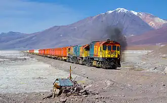 The Ferrocarril de Antofagasta a Bolivia (British company name: Antofagasta (Chili) & Bolivia Railway or FCAB for short) is a private railway operating in the northern provinces of Chile. It is notable in that it was one of the earliest railways built to 2 ft 6 in (762 mm) narrow gauge, with a route that climbed from sea level to over 4,500 m (14,764 ft), while handling goods traffic totaling near 2 million tons per annum. It proved that a railway with such a narrow gauge could do the work of a standard gauge railway, and influenced the construction of other railways such as the Estrada de Ferro Oeste de Minas. It was later converted to 1,000 mm (3 ft 3+3⁄8 in) metre gauge, and still operates today.