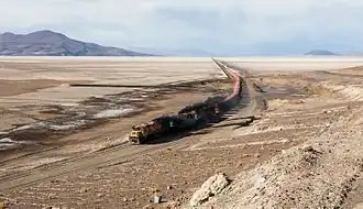 Primary traffic on the railway has always been mineral, first with nitrate (an essential ingredient of explosives prior to World War I) and as of 2020 copper being very important. Sulphuric acid is transported uphill and copper comes down. The railway also transported concentrates of other minerals and lithium brine.[2] Traffic between Bolivia and northern Chile grew in importance and continues to this day.