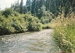 The highest peaks in the county are located along the crest of the Kettle River Range and are part of either the Colville National Forest or the Colville Indian Reservation. Washington State Route 20 crosses over the Kettle River Range along the southern shoulder of Sherman Peak at Sherman Pass, which at 5,575 feet (1,699 m) is highest mountain pass open all year in the state. Boulder-Deer Creek Pass is a paved two-lane county road and one of several critical secondary roads that provide access into and out of Ferry County.[17] Its eastern terminus is with U.S. Route 395 south of Orient, while the western end forms a junction with State Route 21 at Curlew, and the western continuation of the road is labeled as the West Kettle River Road.[18] Boulder Creek Road is one of three passes crossing the Kettle River Range, and the northern most. In the southern Kettle River Range is Bridge Creek Pass between Highway 21 and Inchelium.[17][18] The road starts at approximately 1,800 ft (550 m) at Curlew and climbs up to an crest of 4,600 ft (1,400 m) and then drops back down to about 1.400 ft (0.427 m) at Highway 395.[17]