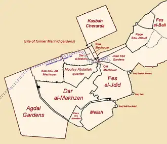 The Marinid city was protected on all sides by two lines of walls, which on the east and west ran together but to the north and south were separated from each by intervening gardens or districts.[6] What is now called the Old Mechouar (Vieux Méchouar), a large walled square fronting the entrance to the Royal Palace, was originally a fortified bridge over the Fes River set between two gates defending the northern entrance to the city. (Unlike today, the gate on the south side of this bridge/square led to the main city rather than directly to the palace, whose grounds did not yet extend to this point.[6]) The northern gate of this bridge was known as Bab es-Sebaa (now called Bab Dekkakin), while the southern gate was known as the Bab al-Qantara ("Gate of the Bridge") or Bab al-Oued ("Gate of the River").[4]: 62 The relative importance of this northern entrance was likely due to the presence of the road to Meknes (the closest major city).[6] From Bab al-Qantara the city's main street (now known as the Grande Rue de Fes el Jdid) ran directly to the southern gate, Bab 'Oyun Sanhaja (now called Bab Semmarine).[6]
