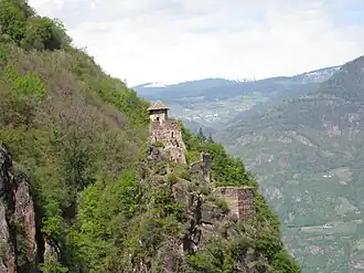 Festenstein Castle (also Burg Festenstein, Ruine Festenstein, Schloss Festenstein, Castelforte, and Castel Forte) is a 13th-century castle ruin, located above Andrian in South Tyrol, in northern Italy. It is perched on a rocky outcrop called the Gaider Schlucht, and can only be reached via a steep mountain climb. The castle was built around the mid-13th century, and was used as a stronghold by the many warlords of the area. It was saved from further deterioration in 2008.