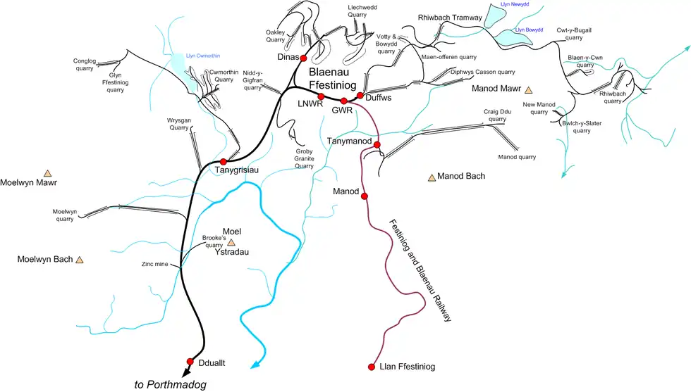 By the early 1860s Llan Ffestiniog had largely become a dormitory town supplying workers to the slate industry around Blaenau Ffestiniog.[6] The quarries at Blaenau were connected to the harbour at Porthmadog by the recently built Festiniog Railway (FR) and as a result were able to significantly increase their output and profitability. However, the FR was struggling to cope ("hopelessly overburdened" according to the standard work on the F&BR[6]) with the volume of traffic from the quarries and some owners – notably Samuel Holland, later to be a local MP – were looking for other outlets for their product at lower charges.