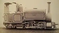Officially the line's gauge was 1 ft 11+3⁄4 in (603 mm), however, a Board of Trade inspection in 1868 recorded it as 1 ft 11+1⁄4 in (591 mm), as did the locomotives' manufacturer's catalogue, repeated in the magazine "Engineer". A survey of the line conducted by Vignes in 1878 gave the gauge as 1 ft 11+1⁄2 in (597 mm).[4] In practice the tolerances were sufficiently wide to allow Festiniog Railway locomotives and rolling stock to use the line, but there is no record of F&BR stock venturing onto FR metals other than transit to Minffordd when their two locomotives made rare visits to Wolverhampton for heavy repair.[5] They are unlikely to have made these trips along the FR in steam and may even have travelled on flat wagons.