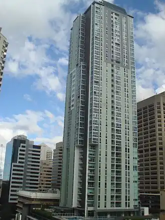 Festival Towers is a skyscraper of apartment buildings located in Brisbane, Australia. It is situated on the corner of Albert and Charlotte Streets. The tower has a modern green facade with a vivid architectural stance.