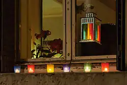 The Festival of Lights (French: Fête des lumières, [fɛt de lymjɛʁ]) in Lyon, France, is a popular event that originally aimed at expressing gratitude toward Mary, mother of Jesus, around December 8 of each year.[1] This unique Lyonnaise tradition dictates that every house place candles along the outsides of all the windows to produce a spectacular effect throughout the streets. The festival includes other activities based on light and usually lasts four days, with the peak of activity occurring on the 8th. The two main focal points of activity are typically the Basilica of Fourvière which is lit up in different colours, as well as the Place des Terreaux, which hosts a different light show each year.[2][3][4][5][6]