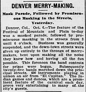 The Festival of Mountain and Plain was an annual celebration of pioneer days in the Old West held in early October in Denver from 1895 to 1899, and in 1901 with a final attempt at revival in 1912.[1] Organized by The Mountain and Plain Festival Association, the event featured a parade and rodeo. It continued until at least 1902. It was a regional celebration and drew pioneers from throughout the West, many of whom had participated in the events celebrated.[2][3]