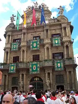 The opening of the festival is marked by setting off the firework chupinazo (or txupinazo in Basque). The rocket was launched at 12:00 noon on 6 July from a city hall balcony, with people celebrating the act in the city hall square and other locations in Pamplona.[6] The chupinazo marked the beginning of the fiesta since 1941. The person who sets it off is decided by the city mayor.[7]