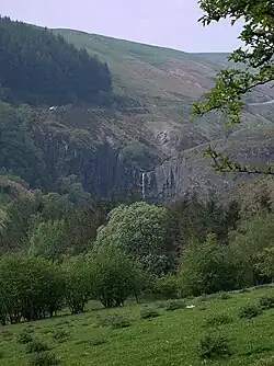The River Twymyn flows from the 40-metre-high (130 ft) Ffrwd Fawr Waterfall at the head of the Pennant Valley at Dylife Gorge near Dylife between Machynlleth and Staylittle.