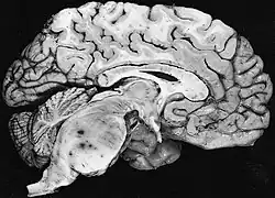 Fibrillary astrocytomas arise from neoplastic astrocytes, a type of glial cell found in the central nervous system. They may occur anywhere in the brain, or even in the spinal cord,[1] but are most commonly found in the cerebral hemispheres. As the alternative name "diffuse astrocytoma" implies, the outline of the tumour is not clearly visible in scans, because the borders of the neoplasm tend to send out tiny microscopic fibrillary tentacles that spread into the surrounding brain tissue. These tentacles intermingle with healthy brain cells, making complete surgical removal difficult. However, they are low-grade tumors, with a slow rate of growth, so patients commonly survive longer than those with otherwise similar types of brain tumours, such as glioblastoma multiforme.[1]