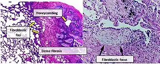 Lung tissue from people with IPF usually show a characteristic histopathologic UIP pattern and is therefore the pathologic counterpart of IPF.[3] Although a pathologic diagnosis of UIP often corresponds to a clinical diagnosis of IPF, a UIP histologic pattern can be seen in other diseases as well, and fibrosis of known origin (rheumatic diseases for example).[1][3] There are four key features of UIP including interstitial fibrosis in a 'patchwork pattern', interstitial scarring, honeycomb changes and fibroblast foci.