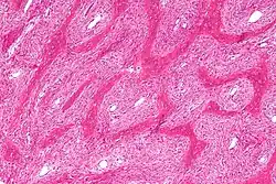 | Micrograph showing fibrous dysplasia with the characteristic thin, irregular bony trabeculae and fibrotic marrow space. H&E stain. | |