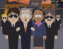 Bush is later shown with an updated look in the two-part episode "Cartoon Wars Part I" and "Cartoon Wars Part II", where he attempts to stop a cartoon depicting the Prophet Mohammed from airing for fear of terrorist retaliation. When he fails and the show is broadcast, Ayman al-Zawahiri makes a "retaliation" cartoon that depicts him and other Americans defecating on Jesus and the American flag.