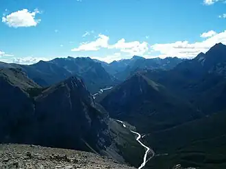 The Fiddle River is a medium-sized tributary of the Athabasca River, flowing into the river near the east gate of Jasper National Park in Alberta, Canada. The Fiddle River forms at the base of Fiddle Pass, with meltwater from Mount Bryant, Mount Gregg, Mount Sir Harold Mitchel, and Mount Barry. The river flows in a general northeast direction before its confluence with the Athabasca. The Fiddle River parallels the road to the popular Miette Hot Springs for a portion of its course.[1]
