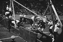 Information on the period 1908 to 1922 is scanty,[3] but it seems that apart from the periods of war the Brickwood Trophy was competed for each year. There have been many changes to the competition. The 1907 challenge involved a team of 17 scaling a 5-foot-high (1.5 m) obstacle on a 75-yard-long (69 m) course and returning. In 1947 the course consisted of seven "very stiff obstacles" over a distance of 440 yards (400 m) each way. Today 18 strong teams compete over an 85-yard-long (78 m) flat track, a total run of 170 yards (160 m).