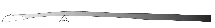 The extent of the stick head along the X+ axis, towards the 'heel' of the Head is confined by the rule requirement that the stick head and the handle meet in a smooth continuous fashion at the line C-C and by a rule restriction on the shape of the handle, which is that the stick-handle must not project beyond the line B1-B1. It is possible to envisage a stick where the width of handle did not extend beyond the line A1-A1, thus allowing a significant extension of the stick head along the X+ axis, but the practicalities of such a design seem to be limited and have not been explored. The length of the Head (or toe) along the X- axis has varied enormously, especially since the Second World War and again after the introduction of the timber lamination process in the early 1980s.