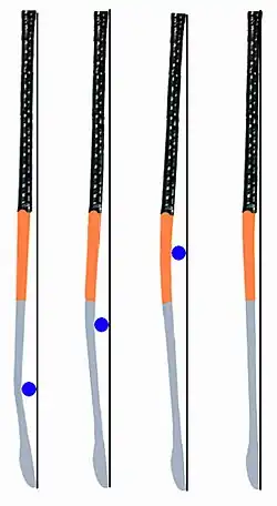The upright forehand hitting stroke, which is commonly used when the ball is close to the feet, will seldom be made with the handle in the same plane as the ball, unless the ball is to the immediate right of the player i.e. beside or alongside his feet. (Stick shown on far right of illustration)—which is generally the case when the ball is being hit directly to the front or from left to right—with a bowed stick even this vertical handle position will present an angled head to the ball. The further away to the front of the player the ball is the greater will be the head angle presented to the ball. To deal with the problem of head presentation some players use a low 'roundhouse' style of hitting, rather than an upright style and may also employ sweep-hits or slap-hitting of the ball (the difference being the positioning of the hands, sweep hits are generally made with the hands together at the top of the stick and with the base of the stick head in contact with the ground, while slap-hits are usually made with the hands in the more spread dribbling grip and the stick head is not necessarily in contact with the ground, but it may be), either sweep or slap type strokes give greater control over the angle of the face of the stick as it makes contact with the ball and are often the preferred strokes when passing the ball over longer distances (over shorter distances—less than 20 m—a push stroke is often preferred).
