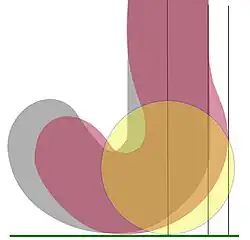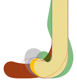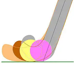 Using extreme examples is useful as a means of demonstrating effects that occur in less extreme configurations but are much more difficult to spot and therefore to explain. The first observation is an easy one (top left in the image captioned "Reversed head in various…"). If the stick head is rotated onto the reverse (lighter colour) the toe is not going to disappear into the ground to enable the reverse side of the stick to be presented to the ball—a vertical adjustment is necessary. Secondly (top right), if the handle of the stick is kept at exactly the same angle and rotated, a horizontal adjustment is necessary to bring the reversed head to a position where contact will be made with the ball. The third figure (bottom left) shows these adjustments having been made (and a change to the angle of the handle because the position of the hand holding the stick at the top would be about the same as it is when gripping the stick in the forehand position), but the area of stick head making contact with the ball is very small; so control may not be adequate. The fourth figure (bottom right) demonstrates that to get good contact with the ball on a larger area of the reversed head, it is necessary to move the handle much nearer to the vertical. This means the player must bring the ball in very close to the feet and come to a more upright dribbling position—this in turn impairs the ability to scan the pitch and keep the ball in peripheral vision at the same time—a considerable disadvantage when dribbling to evade opponents.