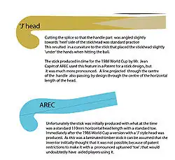 The traditional small arc to the heel edge of the hockey stick had the effect of setting the stick head back slightly. This aspect of stick design (of which the AREC hockey stick was an extreme example) was first explored just prior to the Men's Hockey World Cup of 1986 and resulted in the production of hockey sticks with a stick head considerably more set-back in relation to the handle. The original design, aligning the centre line of the handle with the centre of the ball, in the common striking position, featured a counterbalancing "kink" or protrusion to the handle on the toe edge of the handle, just above the head of the stick. This invention of the kinked-shaft and set-back head stick led directly to rules governing the amount of bend or "permitted deviation" to the "edge sides" of the hockey stick handle. Some of these were later termed "recurve" heads (a description given to a later style, produced by an Australian manufacturer, without the patented kink feature.)