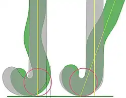 At a common playing angle three different styles of hook stick head present identical ball/handle relationships because the bend of the 'heel' is the same in each stick. An increase in the height of the toe over the ball is very noticeable and is most pronounced in the more 'open' shape. The modern hook does not suffer from the effects of a rotational imbalance in the head as much as the original did because stick heads are now generally tapered towards the toe, rather than of uniform thickness so toe height is not, from a weight and rotational balance point of view, as much of an issue as it once might have been. The stick head is also generally tapered from the midpoint of the striking area towards the bottom curve, so when the stick is in the reversed position the maximum thickness of the head is not at the highest point. This gives a more balanced rotation of the weight of the stick head over the ball.