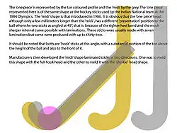Early modification Fig. 1. reduced the horizontal head length to approximate 115 mm and the 'toe height' to approximately 75 mm. A hockey ball is between about 71 mm and 75 mm in diameter (224–235 mm in circumference)—so that put the 'toe height' at the same height as the maximum height of the ball. This is a common feature across hook head designs today, the toe generally varies in height, between the minimum and maximum height of the ball, when the handle is in a vertical position.