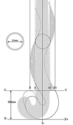 The sample illustrated does not reach the line A1A1 on the 'heel edge' and the Y axis is not central to the shaft, which raises the question "How is the stick positioned for measurement of permitted deviation." The answer is that the vertical axis Y runs through the top centre of the handle and the stick is assumed to be suspended from that top centre point and perpendicular to the X axis (the ground), the curve to the base of the head of the stick being in contact with the ground, it is therefore not necessary for the Y axis to pass through the centre of the shaft just above the head of the stick, although in most traditional sticks it will do so (or very nearly do so—as 'rake' to the handle may cause the Y axis to run a few millimeters to the heel side of the true centre of the shaft). To October 2015 no official measuring method or device for measuring 'permitted deviation' has been approved by the FIH.