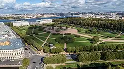 During the reign of Empress Catherine I, the field was termed the "Meadow in front of the Summer Palace" (Russian: Луг перед Летним дворцом), and during the reigns of her successors Empress Anna and Empress Elizabeth, it became the site of their Summer Palaces, designed by Francesco Bartolomeo Rastrelli. Under Empress Anna, the land was used to host military exercises and parades for two weeks every autumn. After these parades the officers dined in the Summer Palace, while the soldiers ate on the meadow.[3] In February 1740 Empress Anna ordered repairs and improvements to the square, including the planting of trees and the removal of some buildings. Architect Mikhail Zemtsov designed 24 garden pavilions, and oversaw the laying out of new paths and tree planting carried out by Harmen van Bol'es and his apprentice Ilya Surmin. A fountain decorated with dragons, dolphins, and mascarons by Konrad Osner was placed in the centre of the square.[3] Further work took place in the early reign of Empress Elizabeth, with new walkways and tree planting.[2][4] The square became known as the "Promenade" (Russian: Променад), and it continued to house attractions and kiosks on public holidays.[3] It was still a popular location for the houses of the rich and powerful, with the former residence of the Duke of Holstein-Gottorp presented by Empress Elizabeth to her favourite, Alexei Razumovsky. Also with their houses here at this period were the court physician Jean Armand de Lestocq and the military commander Stepan Fyodorovich Apraksin.[3]