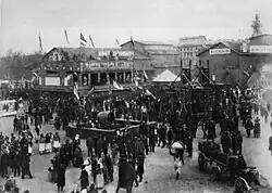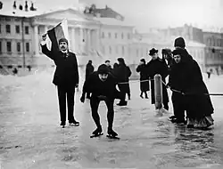 Prior to 1872 Admiralteyskaya Square had also been used as a venue for festivals, but the laying out of the Alexander Garden meant that there was no space for the booths, and the Field of Mars became the sole venue in the city.[3][4] As well as entertainments, sports competitions were also held, with activities such as climbing a greasy pole, and walking on a spinning log.[2] In 1867, concerned about the high levels of drunkenness in the city, authorities placed restrictions on the sale of alcohol during public holidays. In August 1867 some 100,000 people gathered on the Field of Mars, without a single arrest for drunkness.[9] In 1892 a 12-year-old received a set of china for winning the spinning log competition. Festivals were held on the occasions of the parades of the Preobrazhensky and Semyonovsky Regiments from 1897, until 1907 when festivals on the Field of Mars were banned.[3] It was around this time that a tower was built on the field to house a telescope. A proposal was made to construct a bicycle track on the Field of Mars, but it ultimately failed to gain sufficient funding. Sporting events continued to be held on the field during the early twentieth century. It hosted the world championship in speed skating in winter 1903, and in 1913 the first inter-city hockey match was held here. The Saint Petersburg team "Sport" were beaten 2:6 by an English club.[3] A reinforced concrete skating rink was built that year to a design by Yevgeny-Karl Schröter, though the entrance fee was comparatively expensive at 55 kopecks in the afternoon, 1 ruble 10 kopecks in the evening.[3] The building was considered to detract from the existing architectural ensemble, and was dismantled shortly afterwards.[4]