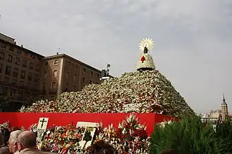 This is the high point of the festival, and a demonstration of the people's devotion to the Virgin Mary. Throughout the day of 12 October, thousands of people dressed in traditional costume, leave flowers at the statue of the Virgin, which has a place of honour in the middle of the Plaza del Pilar. There, an army of volunteers arrange flowers in a pyramidal form, creating a flower mantle around the base of the statue, which remains in the square for the duration of the festival for public viewing. People can participate in the flower offering individually, or as a group. Typically, groups are organized by schools, companies, villages and other entities, and they organize their own parades around the local streets and neighborhoods ending up at the main square.