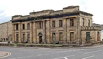 After Waterloo the militia were allowed to decline, and were rarely called out for annual training. The militia ballot was not employed after 1831. The regiments were kept in being by a small and declining cadre of staff and non-commissioned officers.[17] The adjutant of the Fifeshire Militia from 1833 to 1855 was Capt W. Scott, a veteran of the Peninsular War and the Waterloo who had served in the Scots Fusilier Guards. By the 1830s the Regimental Headquarters (HQ) was at Cupar. Lord lieutenants continued to commission officers into the disembodied regiments: both the colonel of the Fifeshire Militia (James Lindsay, appointed in 1835) and his lieutenant-colonel (John Balfour, appointed in 1843) had served in the Grenadier Guards.[13][18] From 1842 to 1895 the regiment used the Old Gaol (built in 1814) at Cupar as its HQ.[19]