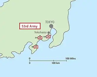 The Japanese 53rd Army was formed on April 8, 1945, under the Japanese 12th Area Army, as part of the last desperate defense effort by the Empire of Japan to deter possible landings of Allied forces in central Honshū during Operation Downfall.[2] The Japanese 53rd Army was based in Isehara, Kanagawa Prefecture and was thus intended to guard the western approaches and beachheads to Tokyo along Sagami Bay.[3] It consisted mostly of poorly trained reservists, conscripted students and Volunteer Fighting Corps home guard militia. It was demobilized at the surrender of Japan on August 15, 1945, without having seen combat.