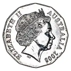 Unlike other decimal denominations, five different portraits of the queen have been used on 50-cent coins. A unique effigy by Vladimir Gottwald was used for the 2000 royal visit commemorative fifty-cent piece.[8] This is the only Australian decimal coin to have an obverse designed by an Australian[9] and to have a portrait of the queen which is not also used on British currency.