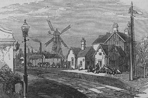 An engraving of Fighting Cocks station, from "The Railway Jubilee at Darlington" in Illustrated London News: 340, 2 October 1875