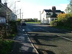 The Fighting Cocks public house in November 2005 seen from the site of the level crossing. The station was located immediately to the left of the road.