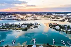 Figure Eight Island is a barrier island in the U.S. state of North Carolina, just north of Wrightsville Beach, widely known as an affluent summer colony and vacation destination.[2] The island is part of the Wilmington Metropolitan Area, and lies between the Intracoastal Waterway and the Atlantic Ocean. As a private island, Figure Eight can only be reached by boat or via a guarded causeway swing bridge—the only private bridge over the Intracoastal Waterway in the American Southeast.[3][4]