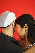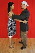 | Apilado (estilo milonguero, estilo del centro [de Buenos Aires]) | Square close embrace | Style milonguero | Milonguero style of embrace is danced in closed position, chest-to-chest, with the partners leaning – or appearing to lean – slightly toward each other to allow space for the feet to move. The follower's left arm position on the leader's shoulder is a style issue. It originates and is used in crowded milongas where there is so much people that you're literally dancing in "square". In those places the lifted arm avoids touching and accidentally hurting other people during turns. Close embrace, no V-shape. | ![]() |