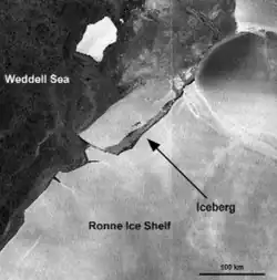 In October 1998 iceberg A-38 calved from the Filchner–Ronne Ice Shelf, the largest iceberg to do so for decades, carrying with it the Filchner Station. The station was to have been the main base for an 800 kilometres (500 mi) expedition in 1999; this was cancelled and replaced with an emergency salvage operation. The recovery of the base was a requirement of the environmental portions of the Antarctic Treaty. On 22 October A-38 split into two, Filchner remained on the western portion which became known as A-38B.[1]