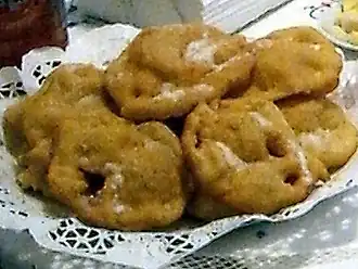 Filhós are usually made by forming balls from a mixture of flour and eggs. When the dough has risen, the balls are deep-fried and sprinkled with a mixture of sugar and cinnamon.[2] This is a traditional Christmas bake in Portugal, although it is now commercialised throughout the year. Although there is not a specific place of origin, this sweet has strong roots in the inland regions of central Northern Portugal.[3]