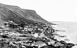 In the 1870s after a revolution against the Spanish rulers, many Filipinos sought refuge in South Africa, mostly in Kalk Bay. The Filipinos were known for being excellent fishermen, and became part of the growing community in Kalk Bay whose livelihood depended on both fishing and whaling.[6] The Filipinos brought the tradition of fishing to Kalk Bay, mainly living in small flats built on the shore. In 1863 the CSS Alabama landed in Cape Town, which was immortalized by the folk song "Daar kom die Alibama". The ship is said to have brought the first Filipino to Cape Town, a lowly fisherman by the name of Felix Florez, who settled in Kalk Bay. Florez is to have recommended Kalk Bay to his other countrymen as a promising fishing settlement. A fisherman by the name of Lime Simon van der Stel wrote in his journal "The fish which His Honour caught were because of their rare, beautiful colours, and were found to be in incredible numbers. It was so easy to catch them that one could not quickly enough throw the hooks into the water in order to draw them up again."[7] An estimated 80% of people currently living on Kalk Bay are descended from Filipinos.[8] Following the 1872 Filipino revolt against Spain there was another influx of new settlers to Kalk Bay.