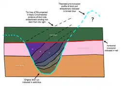 Slumping is a process that can occur to any context in the archaeological record and not just fills. Slumping represents how a context's deposition morphology may deform from its original position by natural settling action. This is readily apparent with fills which have a tendency to settle radically over time. This settling is termed slumping and has a bearing on the excavation of cut features. As fills slump the overlying layers which seal the feature will slump in sympathy creating false impressions of fills below the lip of the cut and introduce the possibility of contaminated dating evidence into the features excavation. (See archaeological section in fig 1). also the degree of slumping of the primary fills compared to the slumping of overlying sealing layers is a possible measure of time differences between the formation of the fills the overlying sequence. This is because sealing layers laid down over a slumping feature with the intent of leveling the area for a specific purpose such as construction will either conform to the slumped fills as though the slump has occurred at the time of the sealing layers formation. Or the sealing layers will not take into account the slumping because the slumping is yet to occur. This can lead to sympathetic slumping up the sequence of other features including later structures.