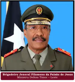 Brigadier General Filomeno da Paixão de Jesus (born 27 March 1953) is an East Timorese politician and former senior officer in the Timor Leste Defence Force (F-FDTL). From July 2018 to July 2023, he was Minister of Defense, serving in the VIII Constitutional Government of East Timor led by Prime Minister Taur Matan Ruak. Between October 2011 and July 2018, he was the Deputy Chief of the F-FDTL.