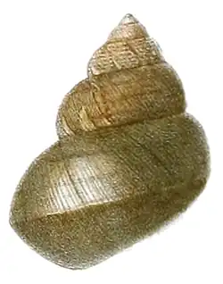 The shape of the shell is ovate-conic.[3] The apex is acute and violet-black in colour.[3] The umbilicus of the shell is very narrow.[3] There are fine spiral lines on the shell.[3] The color of the shell is green or dark brown-blackish.[3] The shell has 6–7 convex whorls.[3] Whorls are with upper spiral lines, some are obsolescently sculptured.[3] The last whorl is swollen.[3]