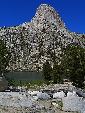 Fin Dome is an 11,673-foot-elevation (3,558-meter) granite summit located 1.5 mile west of the crest of the Sierra Nevada mountain range, in the southeast corner of Fresno County, in northern California.[3] It is situated in the Rae Lakes area of Kings Canyon National Park, approximately 15.5 miles (24.9 km) west of the community of Independence. Nearby peaks include Black Mountain 1.9 miles (3.1 km) to the east, and Mount Rixford 2.1 miles (3.4 km) to the south-southeast. Topographic relief is significant as the east aspect rises 1,135 feet (346 meters) above Rae Lakes in one-quarter mile. The John Muir Trail passes to the east of this landmark, providing an approach. This geographical feature was named by Bolton Brown in 1899 when he explored the lake basin in its vicinity, because it resembled the fin of a sea serpent.[4] The first ascent of the summit was made in 1910 by James Rennie, one of the foremost mountaineers of the Sierra Club.[5]