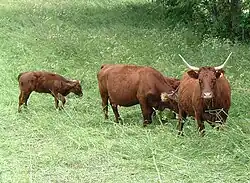 These oxen, generally aged between 12 and 15 years and too old for ploughing, were fattened all winter with unlimited hay before being sold at Easter.[3] Their production became widespread in the 18th century. The quality of the hay was an essential factor in the success of this type of fattening, which is why the finest hay was set aside for distribution to the fattening animals. Numerous authors have praised the particular quality of this hay, such as Giraud-Soulavie as early as the end of the eighteenth century:[4]