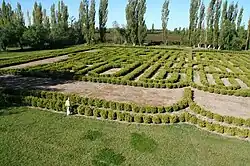 The property includes El Laberinto de Borges (Borges Memorial Maze), a garden labyrinth planted in 2003, which consists of approximately 12,000 English Boxwood shrubs. The 66,456 sq ft (6,174.0 m2) box hedge maze measures 312 ft (95 m) by 213 ft (65 m), and was designed by Randoll Coate,[6] a British diplomat, maze designer, and "labyrinthologist". The maze pays tribute to Jorge Luis Borges (also a personal friend of Coate's) and may have been inspired by Borges' short stories El Jardin de senderos que se bifurcan (The Garden of Forking Paths), and Labyrinths. Shaped like an open book, the design spells out Borges' name as reflected in a mirror, and also pays tribute to writer Maria Kodama, Jorge's widow, by including her initials.
