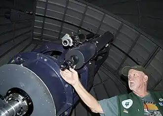 A finderscope is an accessory sighting device used in astronomy and stargazing, typically a small auxiliary refracting telescope/monocular mounted parallelly on a larger astronomical telescope along the same line of sight. The finderscope usually has a much smaller magnification than the main telescope, thus providing a larger field of view, useful for manually pointing (a.k.a. "slewing") the main telescope into a roughly correct direction that can easily place a desired astronomical object in view when zooming in. Some finderscopes have sophisticated reticles to more accurately aim the main telescope and/or even perform stadiametric measurements.