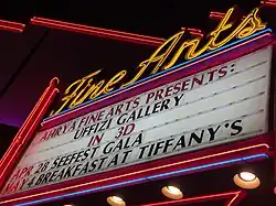 Designed by B. Marcus Priteca, the Fine Arts Theatre opened as The Regina in 1936.[1][2] Executed in the zigzag moderne style,[2] it was remodeled and renamed the Fine Arts Theatre in 1948, premiering The Red Shoes and playing host to guests such as Susan Hayward, Joan Crawford, Ava Gardner, and Shirley Temple.[1]