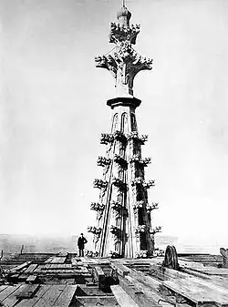 A wrought-iron rod 10 centimetres in diameter and 21 metres long was passed through the centre of the shaft to stabilise it with a copper sheath. This rod hangs downwards into the tower's spire and is weighted down in the manner of a pendulum.