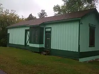 The interior of the depot consists of a freight room at the southern end, the office at the center, and the waiting room at the northern end. The office's trackside bay window is flanked by a wide freight door to the south and a single-leafed five paneled passenger entrance to the north.[1]